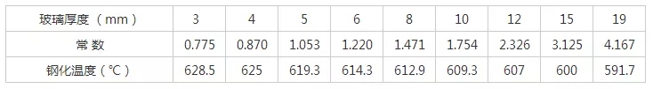 (2)加熱時間改變+/-t=+/-ΔT×常數(秒),其中+/-ΔT為玻璃離開爐子時的溫度變化量,不(bú)同厚度玻(bō)璃的常數值如下: