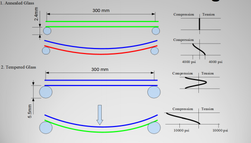 對於300mm長度的退火玻璃,隻(zhī)需要2.4mm的彎曲深度彎曲,經測試抵消玻璃表麵為約27.6MPa(4000psi)的張力就足以使玻璃破碎。
