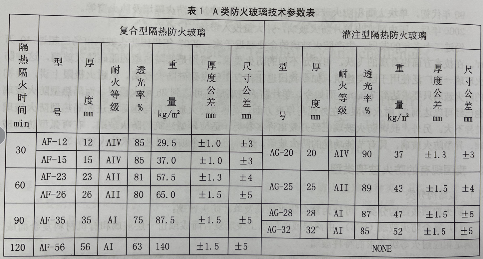 A類防火玻璃技術參數表