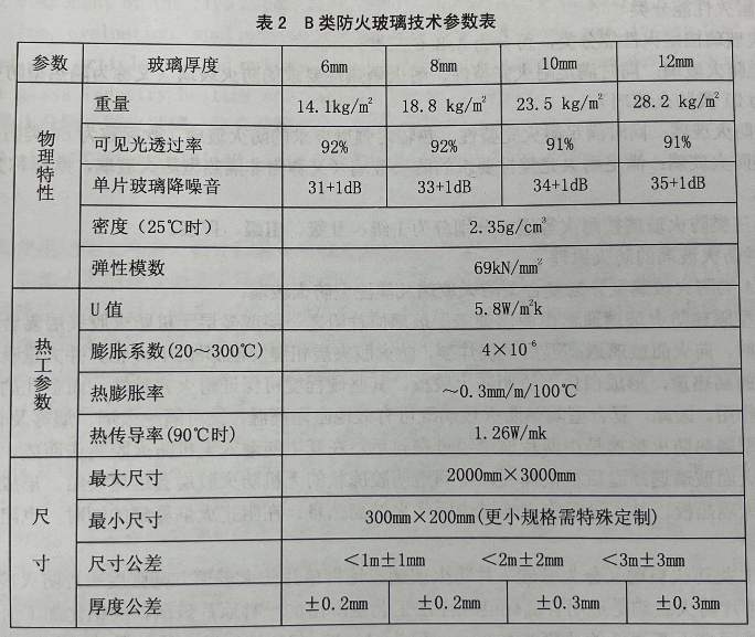 B類防火玻璃技術參數表